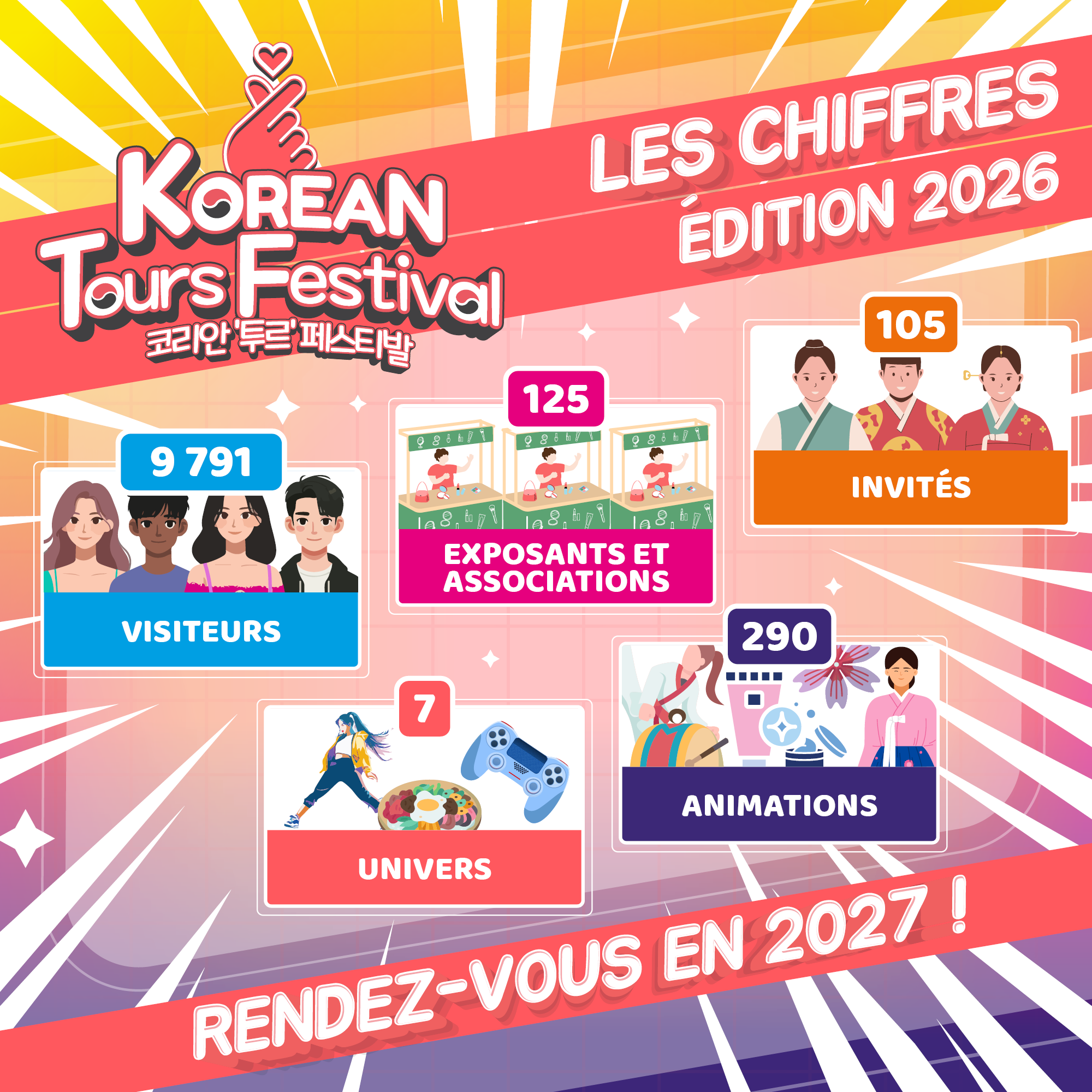 Les 27, 28 Février et le 1er Mars 2026, le Palais des Congrès de Tours proposera à nouveau, après le succès de la première édition, une expérience autour de la Corée du Sud et de la culture Pop avec de nombreux invités, animations et exposants.